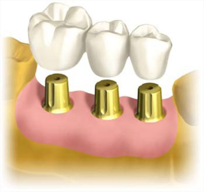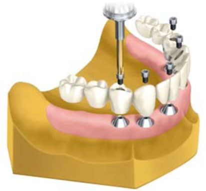 Ортопедические конструкции с цементной фиксацией с опорой на имплантаты аналогичны обычным коронкам и мостовидным протезам, устанавливаемым на естественные зубы. Препарированный абатмент привинчивают к имплантату. Коронку или мостовидный протез цементируют к абатментам традиционным методом. Преимущества данной методики – лучший эстетический результат по сравнению с винтовой фиксацией. ![]() Ортопедические конструкции с винтовой фиксацией к имплантатам показаны при недостаточном расстоянии между зубными рядами или другим соображениям. Конструкция удерживается при помощи винтов, которые, проходя сквозь окклюзионную поверхность протеза ,ввинчивается непосредственно в имплантанты. Отверстия закрываются пломбировочным композиционным материалом. Преимущества данной методики – простота снятия протеза для осмотра и проведения гигиенических мероприятий, возможность протезирования при минимальном межвеолярном расстоянии.